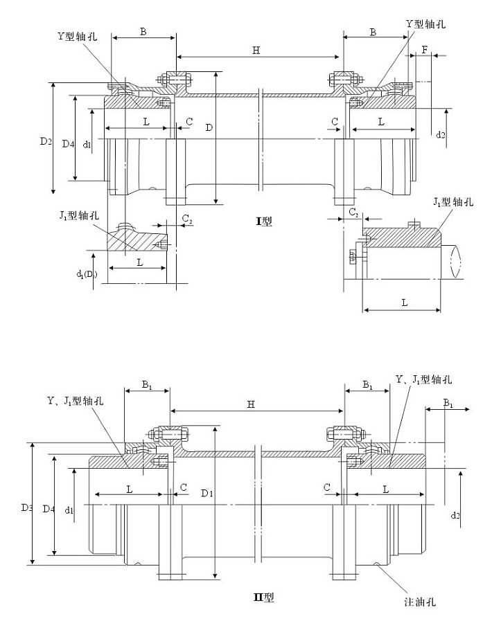 I型--密封端蓋為分離型,齒間距較大,可以允許較大的徑向位移,可與Y、J1、Z1型軸伸聯接;